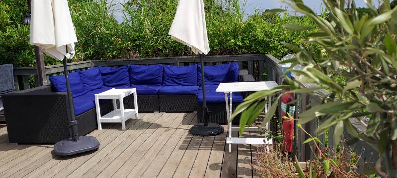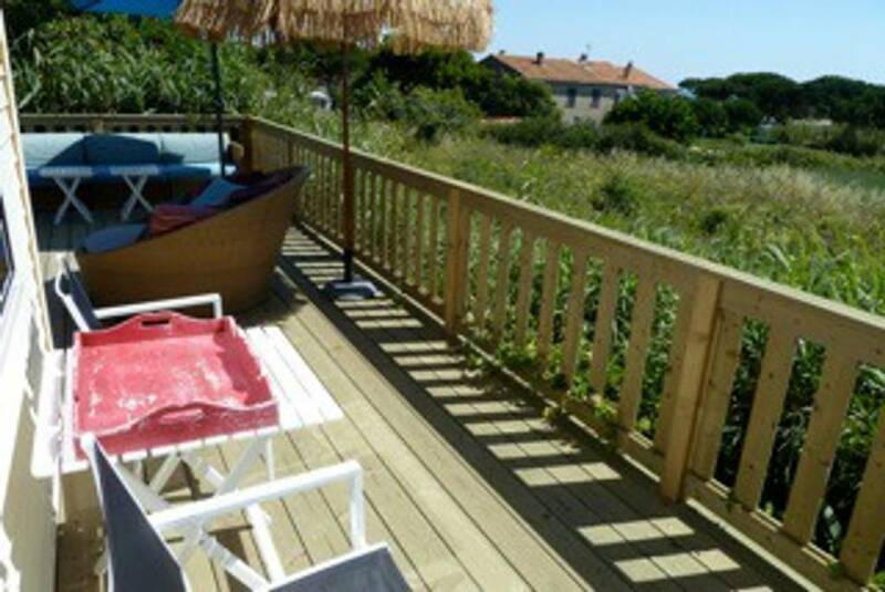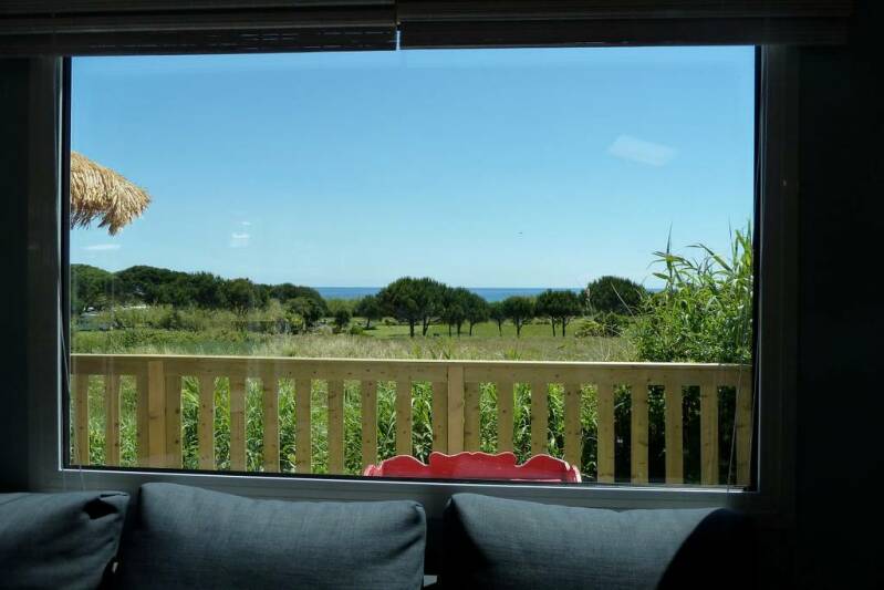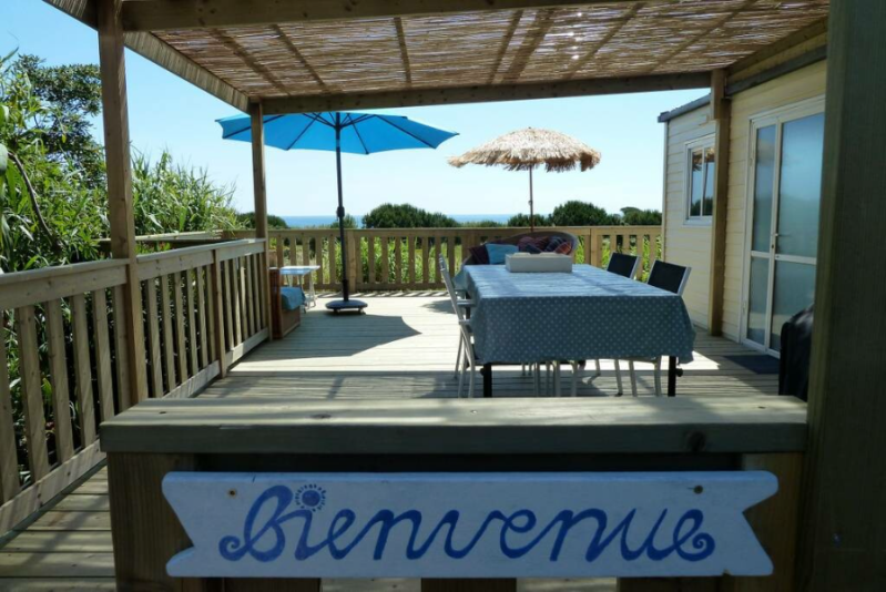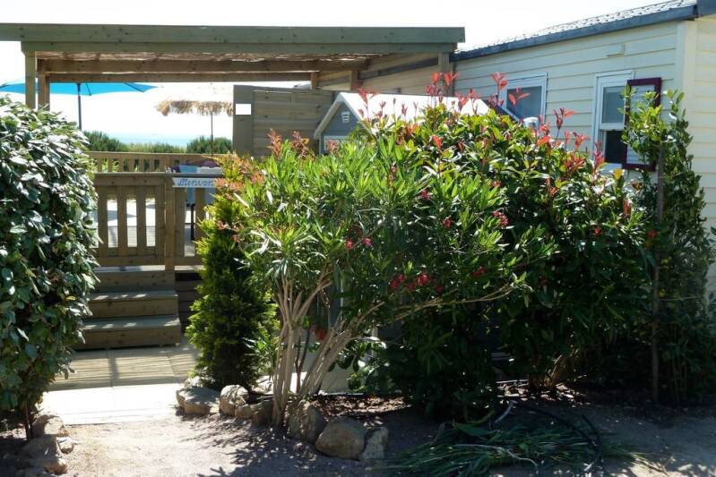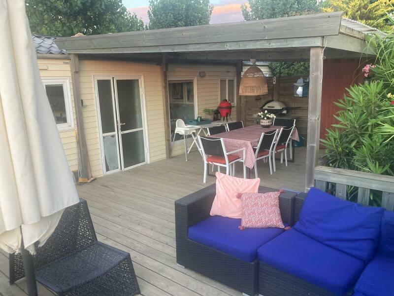 "Mobilehome Annebel" with 2 bedrooms, quiet place, covered wooden terrace on the panoramic (with sea view on the bay), equipped with TV, air-conditioning 2x, shower room, dishwasher, washing machine, Nespresso, coffee machine, lounge set, gas barbecue and about 350 meters from the beach.