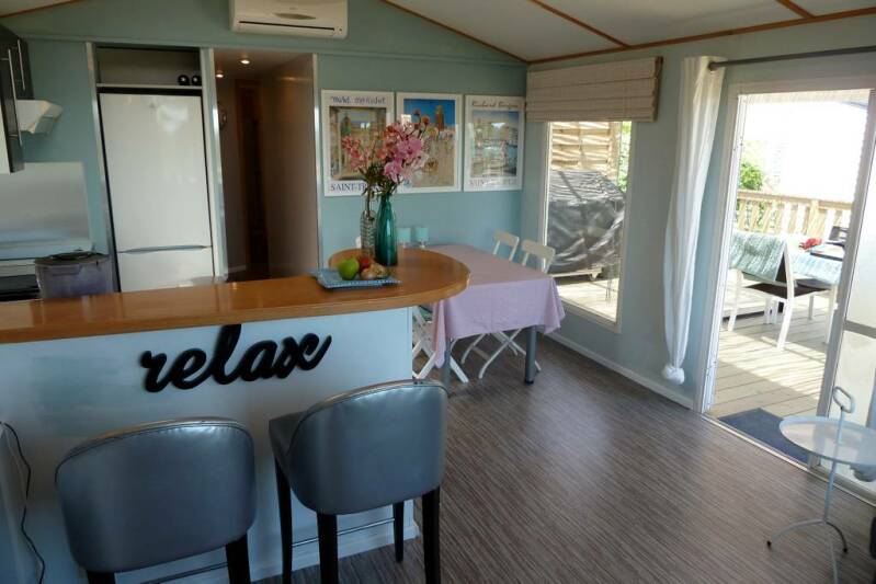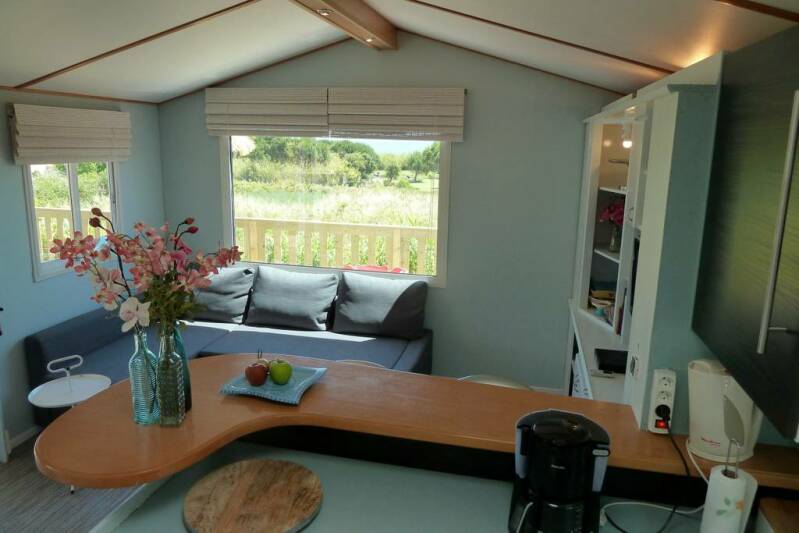"Mobil-home Annebel" avec 2 chambres, endroit calme, terrasse couverte en bois sur le panoramique (avec vue sur la baie), équipé de TV, climatisation 2x, salle de douche, lave-vaisselle, machine à laver, machine à café, Nespresso, salon de détente, barbecue à gaz et à environ 350 mètres de la plage.